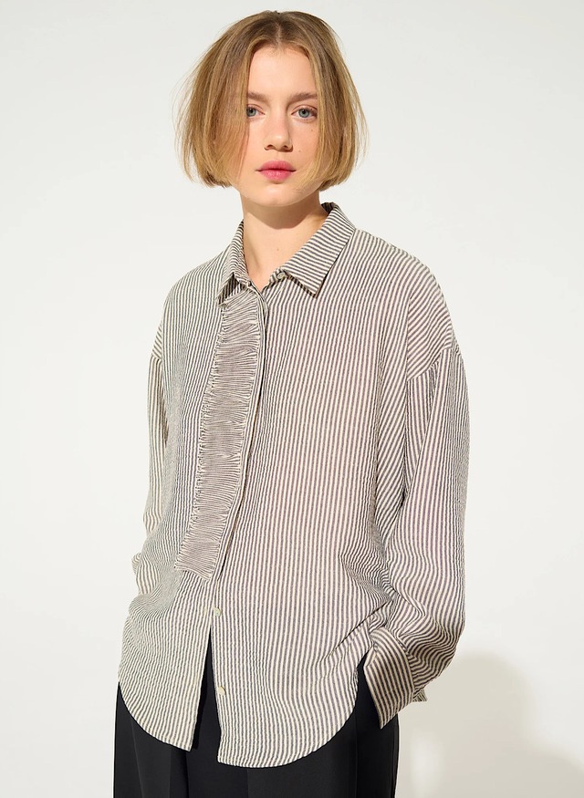【オーバーサイズプリーツシャツ】 ツートンストライプのデザインが魅力的な オーバーサイズプリーツシャツです。 ゆったりとしたシルエットに 肩が下がったデザインが 優雅な印象を与えます。 ダブルプリーツのクリスタルフリルに 平らなプリーツを手縫いでジグザグに 仕上げました。 【品番: CAF2K010】 素材 ポリエステル 100% Made in Tunisia 洗濯可 ※お洗濯の際は、必ず商品タグの洗濯方法をご確認ください。 ※写真と実物では色味が異なって見える場合がございますので、予めご了承くださいますようお願い申し上げます。 【サイズ】(平置き採寸による) S(T0) 着丈 70cm バスト 56cm M(T1) 着丈 71cm バスト 62cm *個体差により多少誤差がございます。 *店舗でも販売しておりますため、万一、商品の品切れ等によりお届けできない場合はご容赦くださいませ。 *離島へのお届けをご希望のお客様は下記ページより送料の追加をお願い致します。 https://shop.yourstore.com/items/12346006