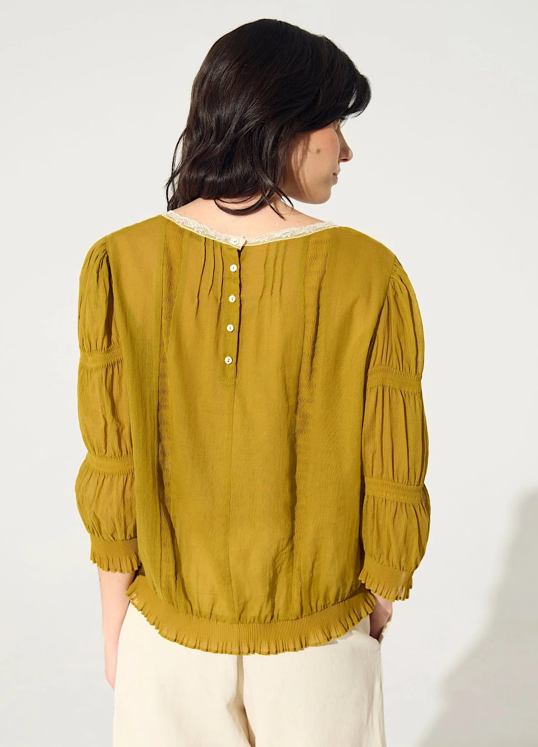 綿素材の質感にもこだわり、最高級の肌触りを再現しました。襟のカットや、袖部分の切替が特徴的ですごく雰囲気のある1着です。