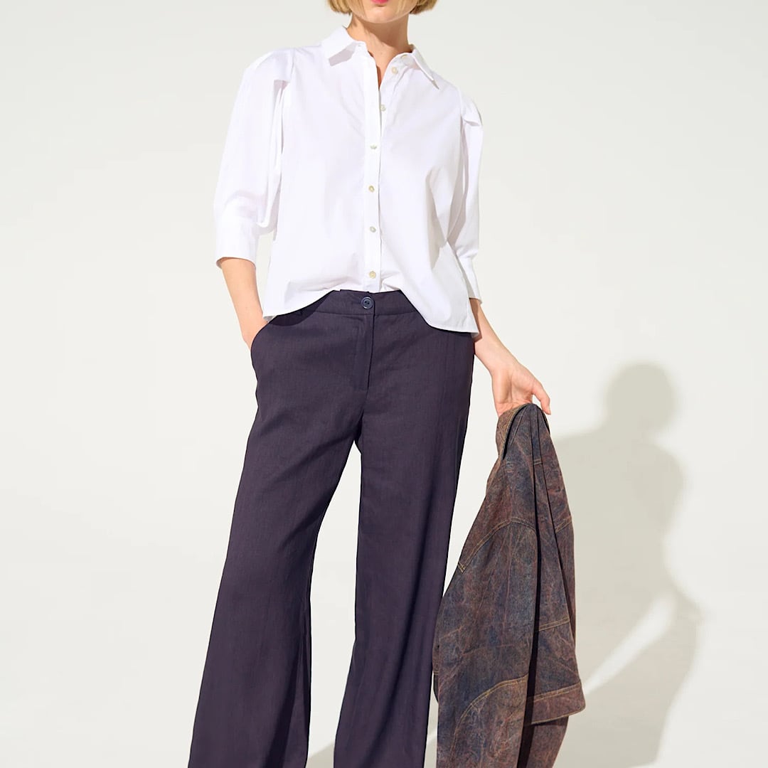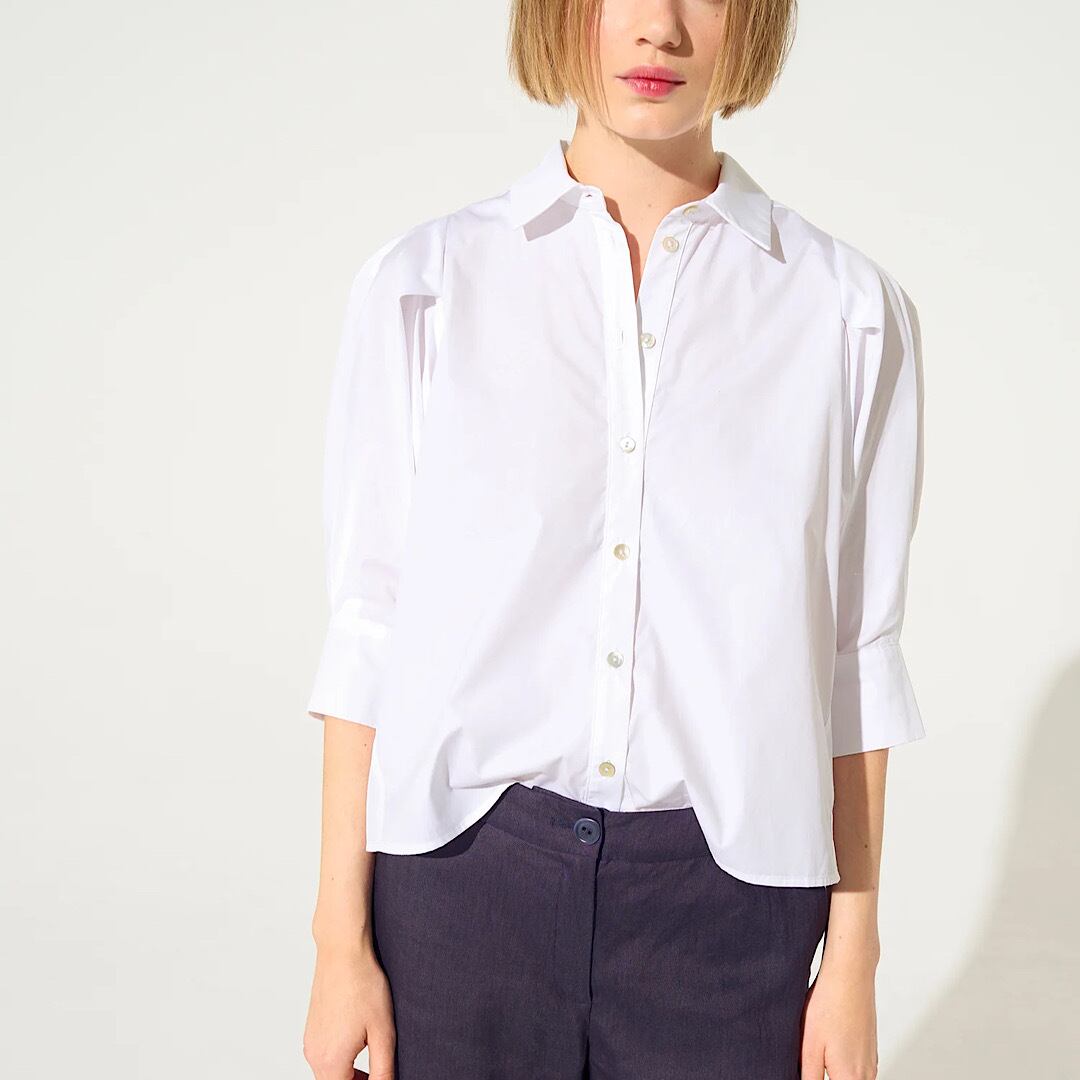 肩のパフスリーブと程よく短い丈感のバランスが絶妙で、女性らしさをぐっと引き立ててくれます。無地でシンプルながらも、手の凝ったデザインがスタイリッシュに決めてくれます。