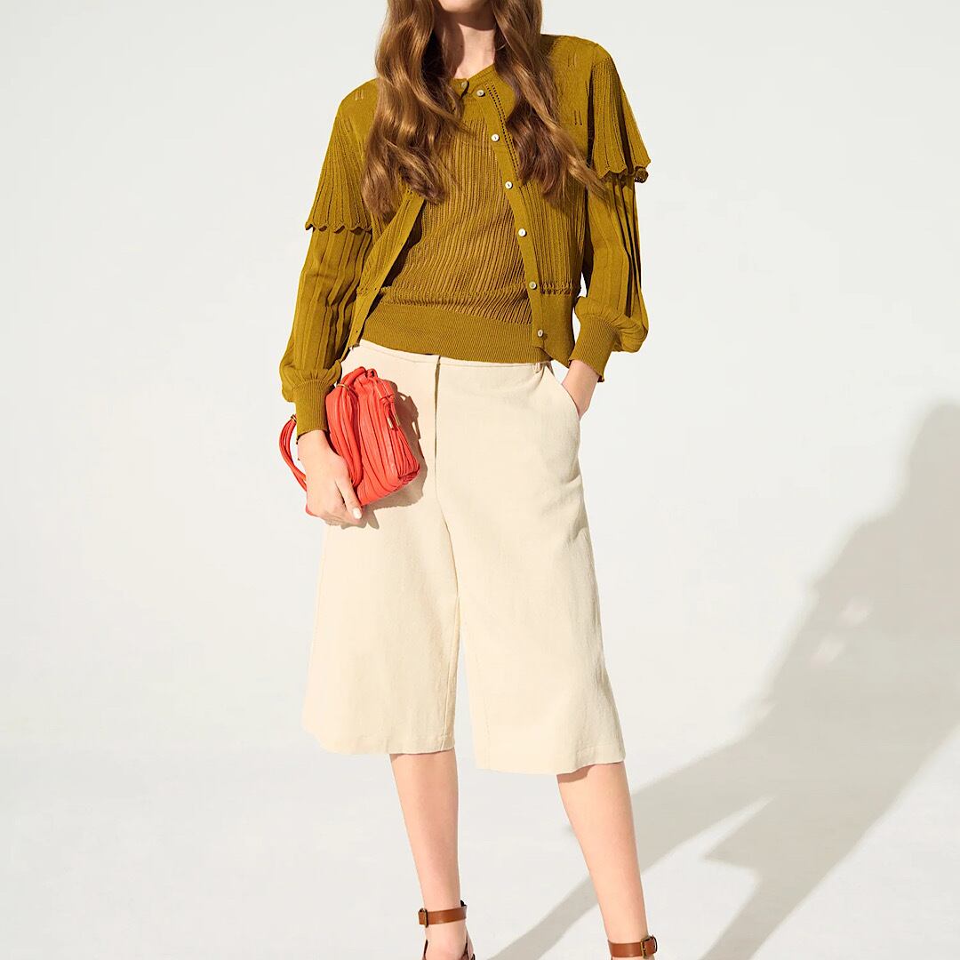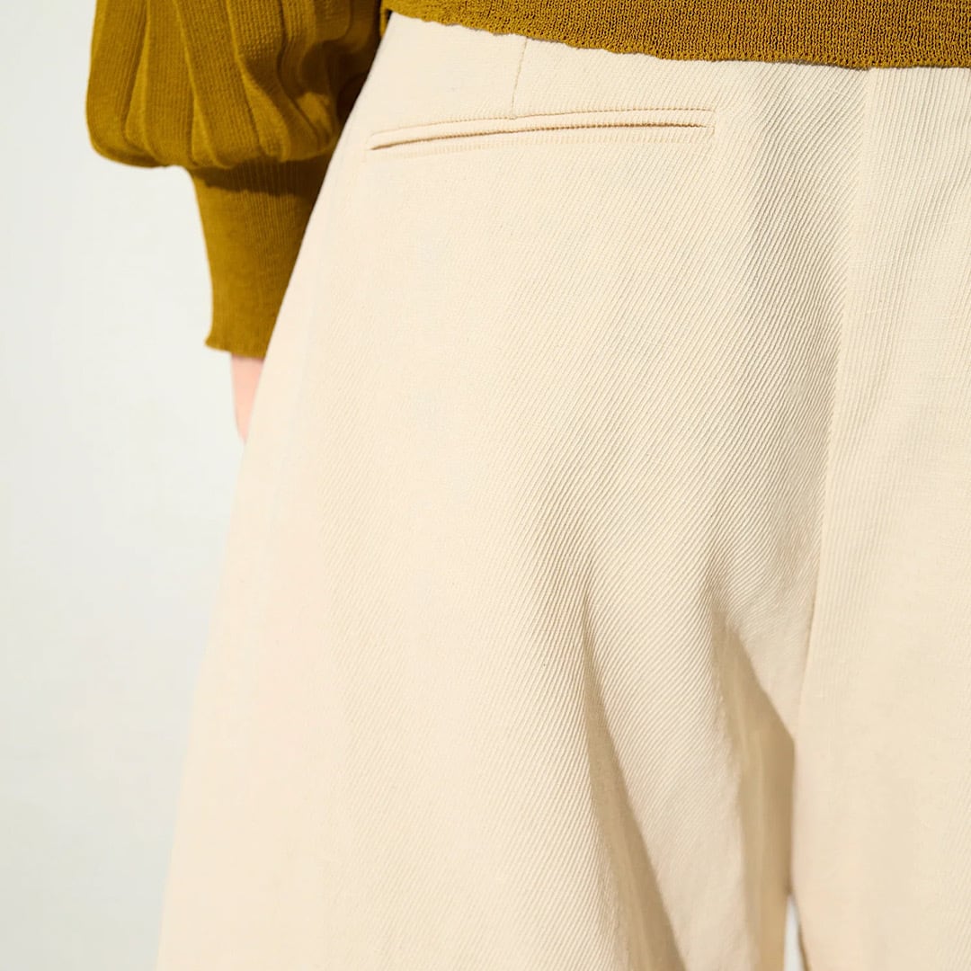 膝丈の履きやすい丈感が特徴で、普段のコーディネートにはもちろん、旅行などの写真映えにもなるアイテムです。