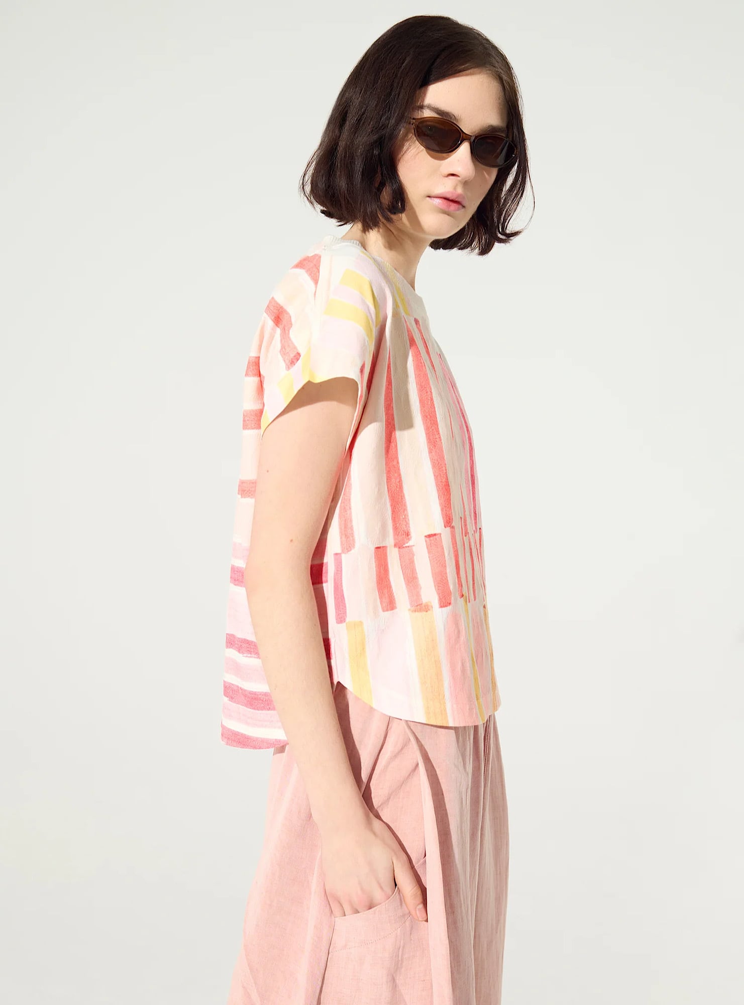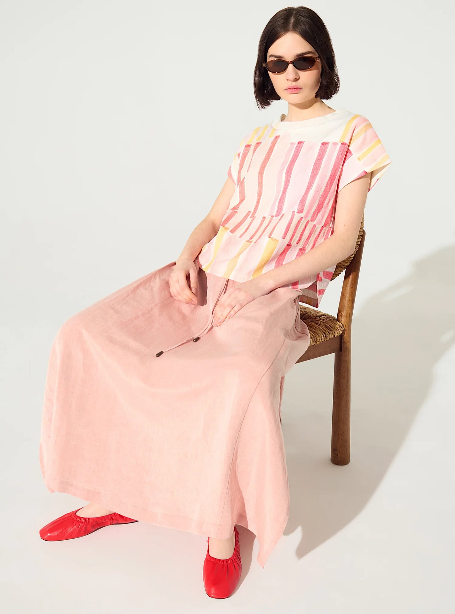 さらりとした麻素材の柔らかい質感が心地よく、毎日のコーディネートに華やかさをプラス。裾にはスリッドが施されており、脚さばきもしやすく動きがあって履きやすい一着。