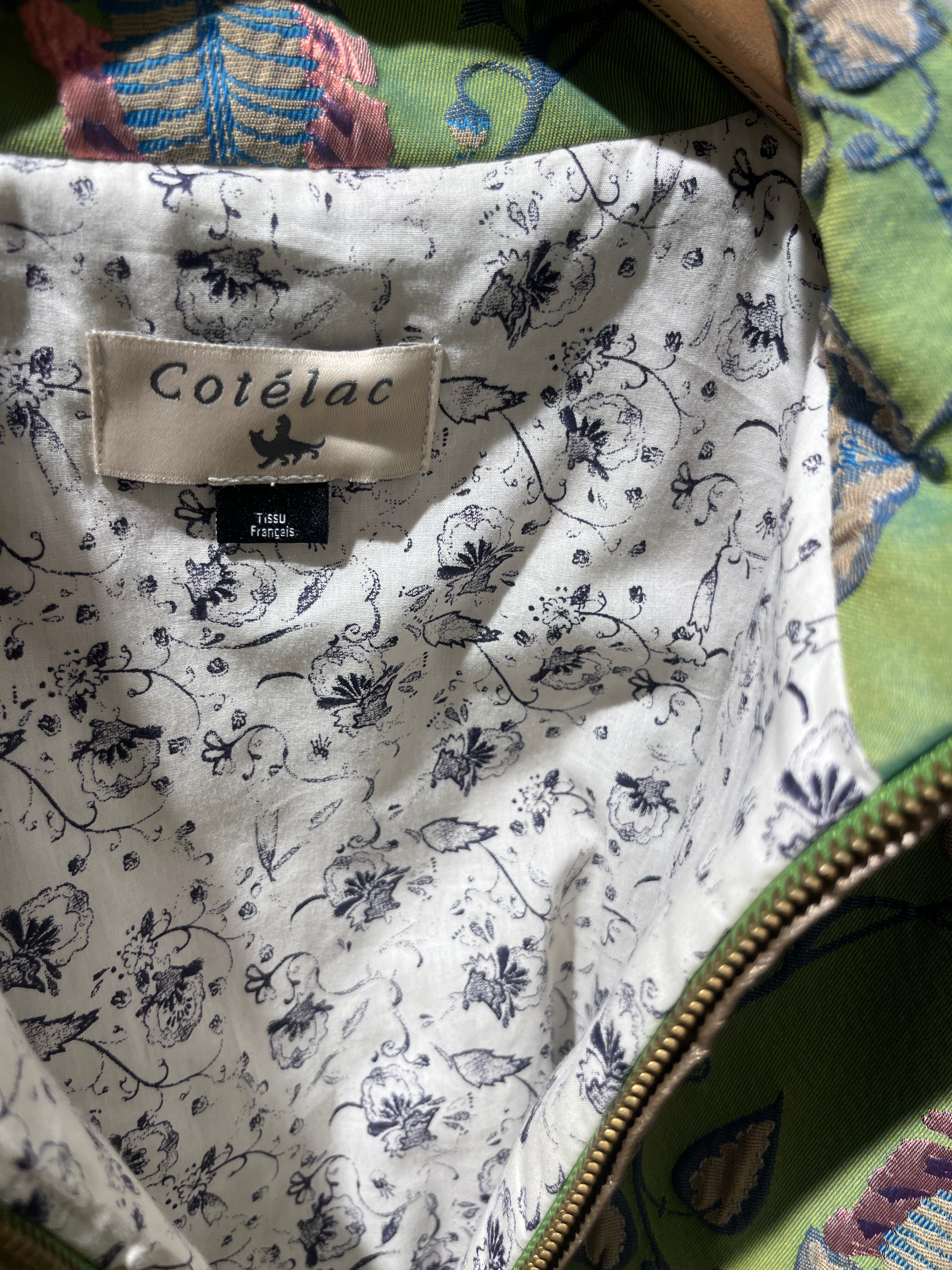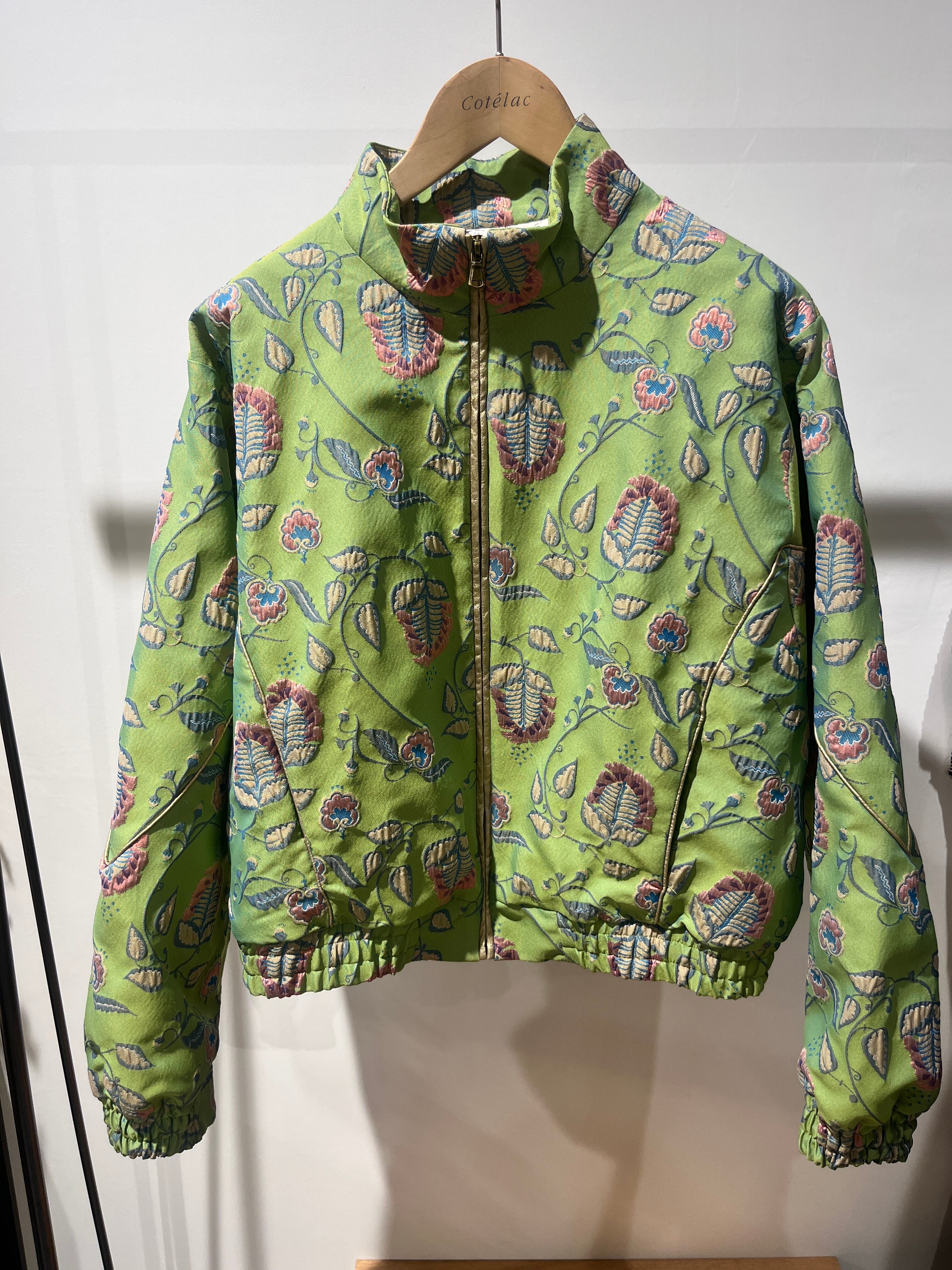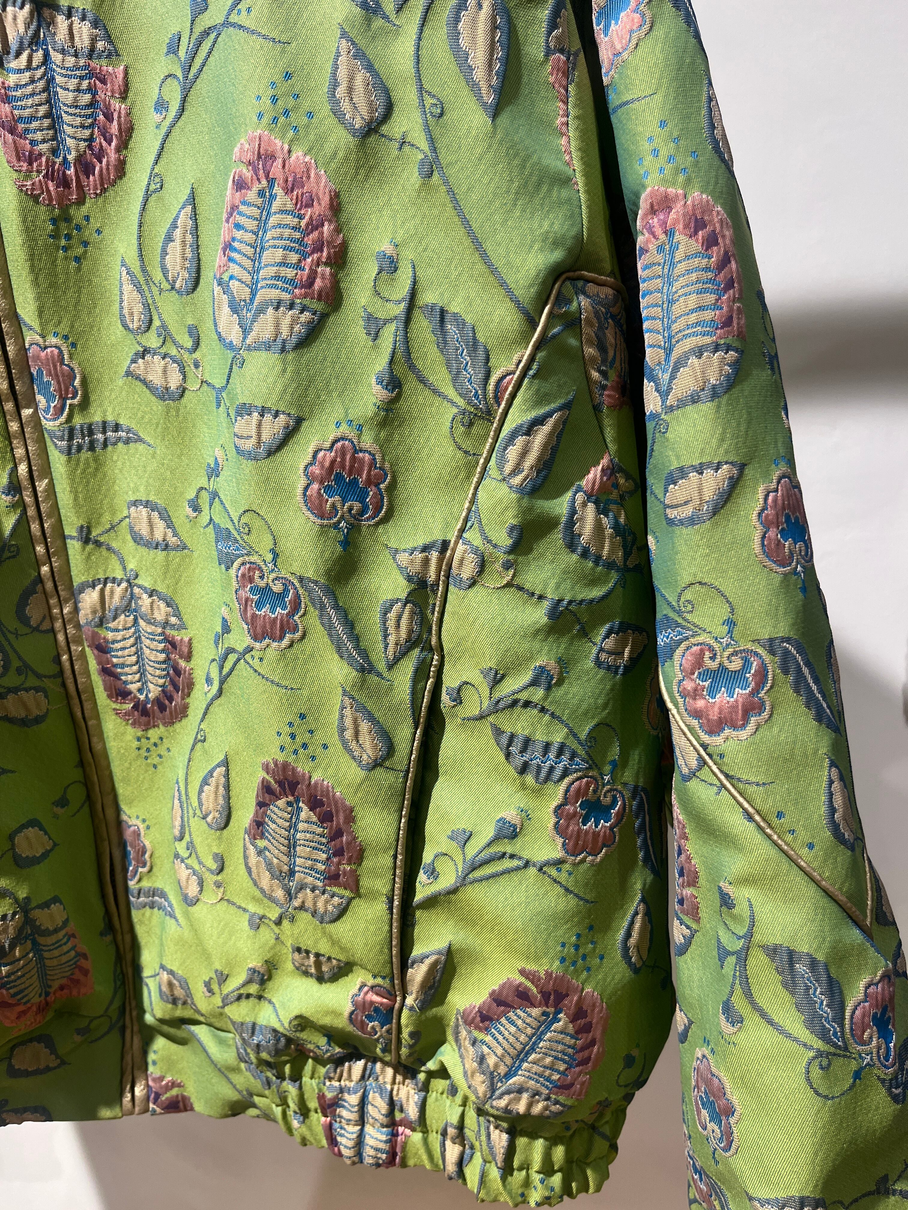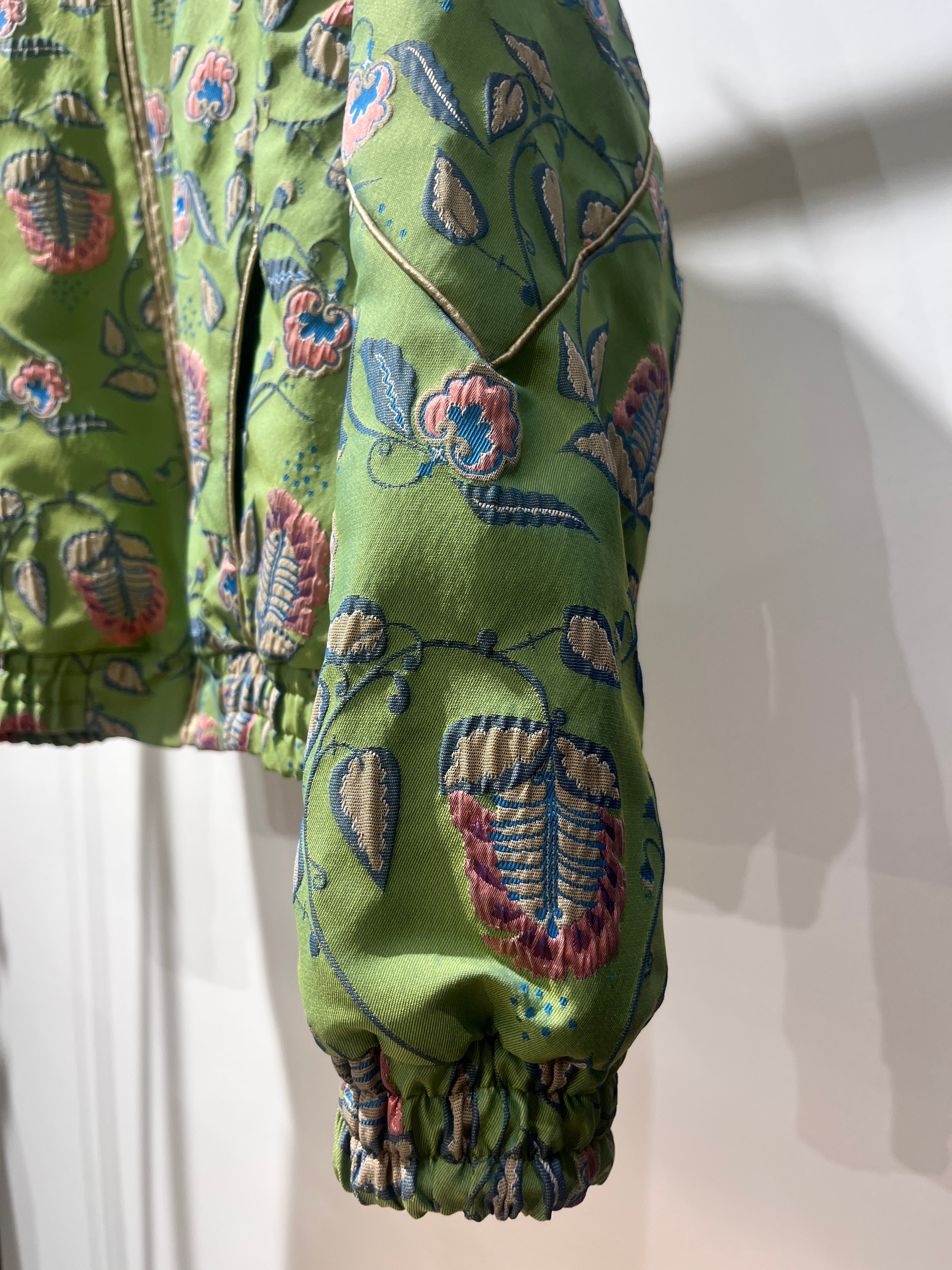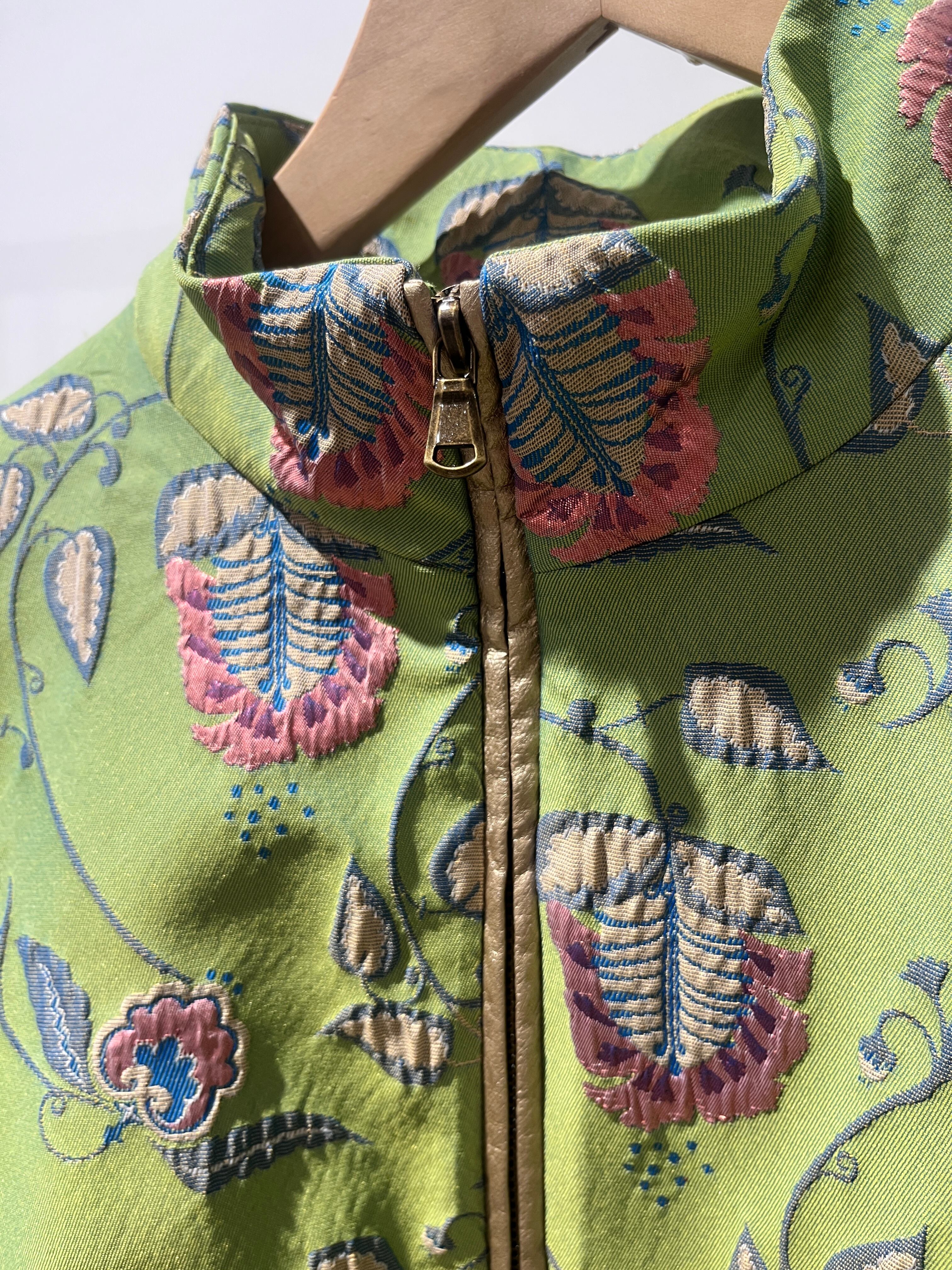 このオーバーサイズジャガードジャケットは、フランス・リヨン地方で織られた高品質なジャガード生地を使用しています。メタリックカラーの糸を織り込んだことで、上品で華やかな印象を与え、とても存在感のあるアイテムです。さらに、アンティークゴールドのパイピングカラーがアクセントとなり、洗練されたデザインに仕上げています。